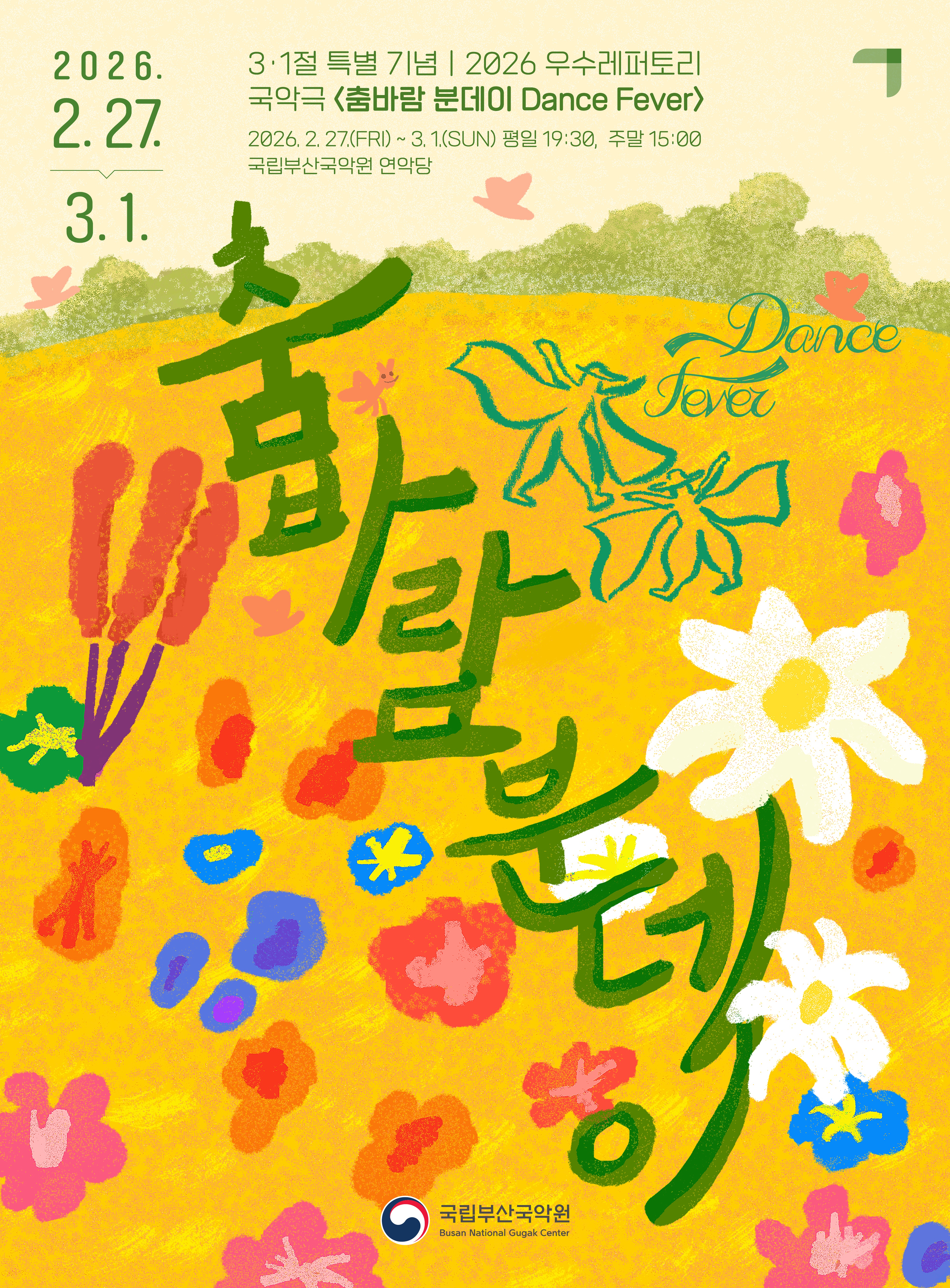 2026.01.23안녕하세요, 국립부산국악원 국악체험관 2026 SNS 인증 새해맞이 이벤트 안내드립니다. 국악체험관 방문 시 SNS 후기를 작성해주시면 '액막이 명태 풍경 만들기 키트'를 증정해드리고 있습니다. 이벤트 기간: 1.15.(목)~소진시 조기 종료 매주 화~토 오전 10시~11시 30분, 오후 2시~5시 증정 가능 이벤트 수령 장소: 국악체험관 지하1층 다목적홀Ⅰ출입구 대형 LED 패널 옆 많은 관심과 참여 부탁드리겠습니다. 감사합니다. 문의: 051-811-0035