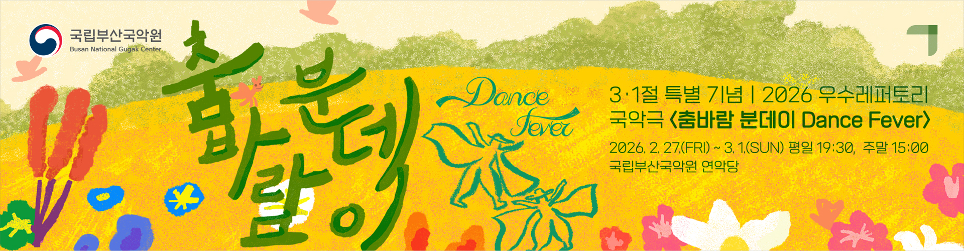 2026.01.15국립부산국악원 공고 제2026-11호국립부산국악원 국악연주단 객원단원(휴직자 대체) 채용 공고2026년 국립부산국악원 객원단원 공개경쟁 채용시험 계획을 다음과 같이 안내드립니다.2026. 2. 3.국립부산국악원장